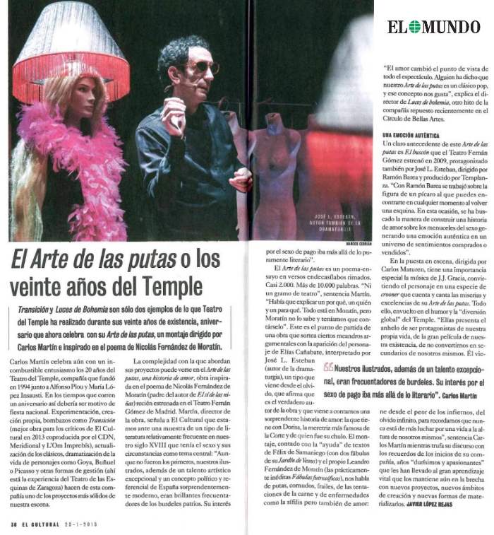 También queremos compartir el artículo de hoy 23 de Enero 2015 de EL MUNDO en el que celebra el XX Aniversario de Teatro del Temple y reseña nuestro espectáculo Arte de las Putas que actualmente tenemos en cartelera en Madrid.