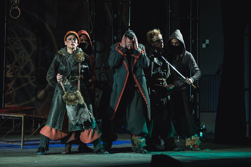 Contamos para ello con un músico en escena que crea un sugerente ambiente sonoro lleno de ritmos y sonidos evocadores y con una estética en la escenografía, el vestuario y la luz que busca los claroscuros, las capuchas que cubren o descubren, los objetos multifuncionales que junto con los actores construyen cárceles o palacios, masas en movimiento o angustiosos espacios vacíos. [dt_gap height=»30″ /]