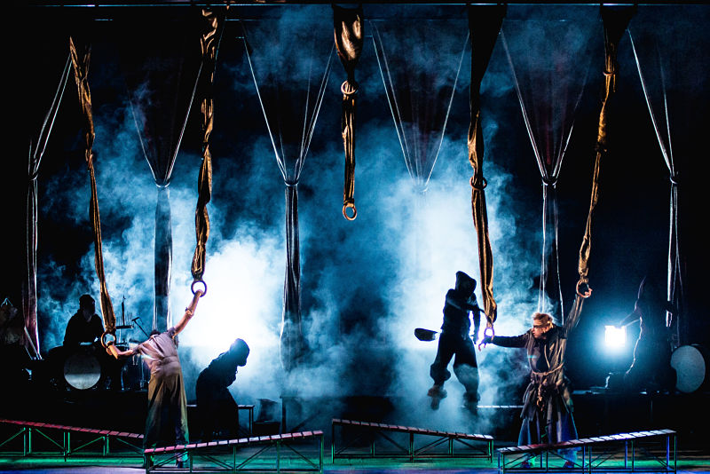 Contamos para ello con un músico en escena que crea un sugerente ambiente sonoro lleno de ritmos y sonidos evocadores y con una estética en la escenografía, el vestuario y la luz que busca los claroscuros, las capuchas que cubren o descubren, los objetos multifuncionales que junto con los actores construyen cárceles o palacios, masas en movimiento o angustiosos espacios vacíos. [dt_gap height=»30″ /]
