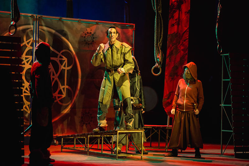 Contamos para ello con un músico en escena que crea un sugerente ambiente sonoro lleno de ritmos y sonidos evocadores y con una estética en la escenografía, el vestuario y la luz que busca los claroscuros, las capuchas que cubren o descubren, los objetos multifuncionales que junto con los actores construyen cárceles o palacios, masas en movimiento o angustiosos espacios vacíos. [dt_gap height=»30″ /]