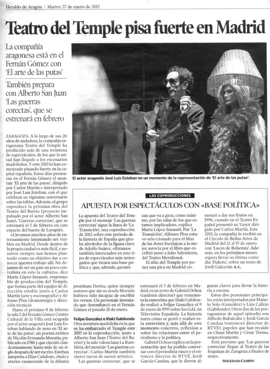 Heraldo de Aragón en su edición en papel del 27 de Enero de 2015 recoge un amplio reportaje a toda página sobre la estancia de la Compañía en Madrid y el XX aniversario de la Compañía, así como adelanta la noticia sobre su próxima coproducción con Alberto Sanjuan (Teatro del Barro) y su estreno el próximo 5 de marzo. [dt_divider style=»thin» /][dt_gap height=»20″ /]