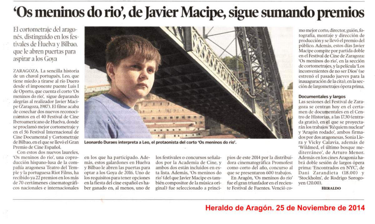 trofeo2014El cortometraje Os Meninos do Rio, del director zaragozano Javier Macipe Costa, y coproducida por Temple Audiovisuales y Riot Films,  acaba de recibir otros 4 premios de otros tantos festivales del cine en España. Además en el 19 Festival de Cine Zaragoza por partida doble pues al Premio Augusto al mejor cortometraje aragonés de ficción hay que añadir el otro premio que obtuvo su director como Premio Augusto al mejor lagometraje ópera prima por su película Los inconveniente de no ser Dios, producido por la fundación Antonio Gala de Córdoba. [dt_gap height=»10″ /]