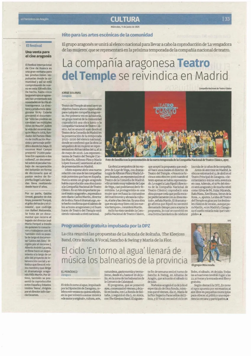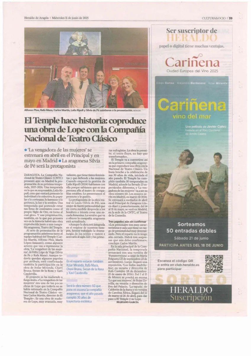 El Temple va a convertirse así en la primera compañía aragonesa que coproduce una obra con la Nacional de Teatro Clásico. Un buen broche a la celebración de sus 30 años de vida, iniciada el año pasado. El Temple ha cumplido también 30 temporadas en Madrid, adonde ha llevado 23 espectáculos diferentes, y ‘La vengadora de las mujeres’ va a ser su obra número 60. Los ensayos serán en Madrid, en marzo del año próximo. Se estrenará a mediados de abril en el Principal de Zaragoza (cinco días) y posteriormente, del 14 al 31 de mayo, se verá en Madrid, en la sede de la Compañía Nacional de Teatro Clásico.